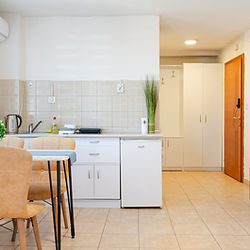 Solis Apartment offers a bright and comfortable one-bedroom living space in a well-connected urban area of Ohrid. With its modern interior, warm color accents, and smart open-plan layout, the apartment is ideal for those seeking a relaxed yet practical home close to everyday amenities. Designed to feel welcoming and functional, Solis Apartment is perfect for long-term living while enjoying the charm and convenience of the city. Features and Amenities - Bright, open-plan living area with large windows and natural light - Fully equipped modern kitchen with dining space - Air conditioning and heating for year-round comfort - Private bathroom and dedicated laundry area - Comfortable living room with flat-screen TV and modern furnishings - Contemporary interior design with warm, cozy details - Secure building access - Quiet yet central neighborhood with easy access to shops, cafes, and main roads Ideal For - Professionals looking for a comfortable and well-located home in Ohrid - Couples who appreciate a modern, clean, and bright living space
